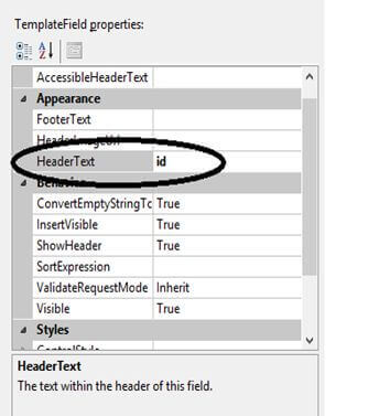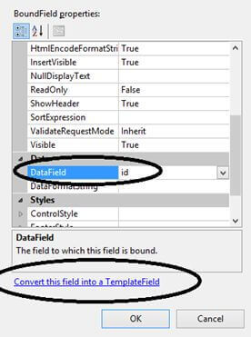 Now click on ID and in the next section you will see Template Field Properties. In that go to HeaderText then provide the name of the header that you want to show in your Grid view Column. Then in that section find Data Field then name it ID. At the bottom part of Template Field Properties is “Convert this field into Template Field”, click on that. You will see your Bound Field converted into a template field. Press OK. In the same way you need to do Name and City. If you get any problem you can ask me in comments.