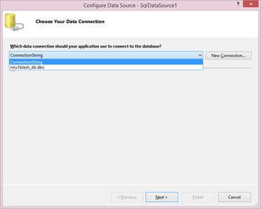 Since you had added a SQL Server Database (Database.mdf), select from that dropdown SqlDataSource1. You will get something like this: