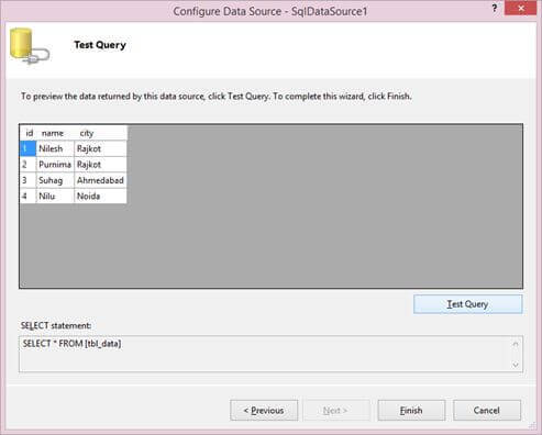 As you can see they queried Select * from tbl_data so we will get our data from the database into our Grid View in our browser. Just press Next. You will get to the Test Query Window. Then press Finish.