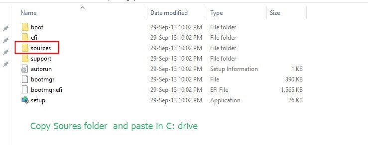 From these bootable files copy the sources folder and paste this folder in C: drive, here's the image: