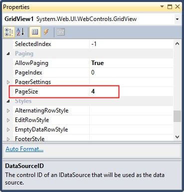 This is the GridView design and the properties window where you need to include the even–page changing index and page size = 4.Figure 2: PropertiesFigure 3: GridView Paging CODE CHAMBERStep 5