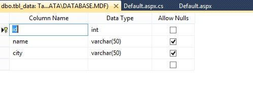 In Server Explorer, click on your database (Database.mdf), then select Tables -> Add New Table. Form the table like the following:Table tbl_data (Don't forget to make the ID as IS Identity -- True)Figure 1: Tbl_DataDESIGN CHAMBERStep 4