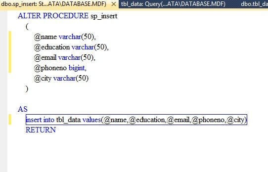 Make one Stored Procedure for inserting data into the database, by going to database.mdf then seelct Store Procedures then right-click then select Add New Store Procedure.