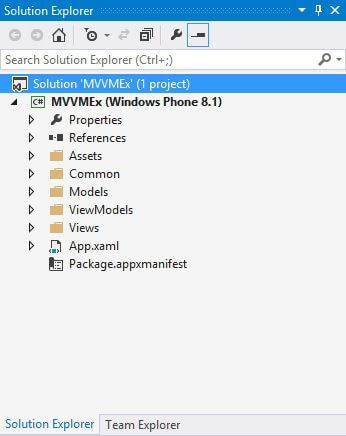 First of all, open up a new project and name it “MVVMEx” or whatever you want. Now, simply delete your “Mainpage.xaml”. Don't freak out, it's a way to do the modification. Now, add the three folders “Models”, “ViewModels” and “Views” one by one, like this.