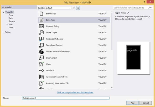 Now, it is a kind of remake of our Data Binding example from my last article. In the “Views” folder right-click and add a new “Basic Page”, give it the name “AutoView”.