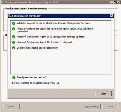 Now login to the deployment agent machine using the Ghost account and open Microsoft Deployment Agent 2013. A configuration window will be opened, there you must provide the RM server URL and account to connect. You should provide the ghost account and click on Apply Settings. If your configuration is successful, the following window will be shown.