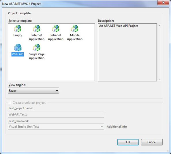 - In the New ASP.NET MVC 4 Project dialog, select Web API. The View engine will be Razor by default then click OK.