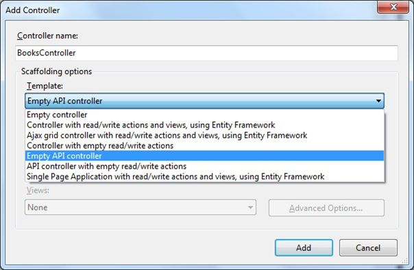 In the Add Controller wizard, name the controller BooksController. In the Template dropdown list, select Empty API Controller. Then click Add.