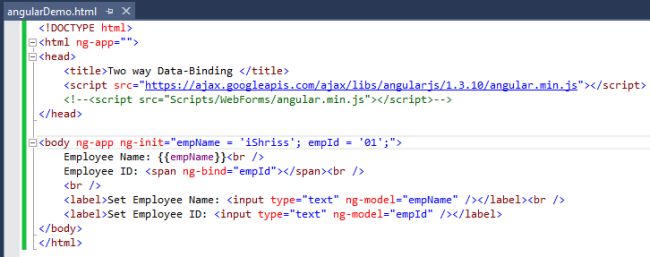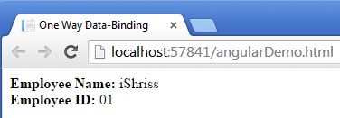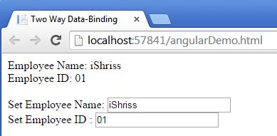 In the preceding example, empName and empId are two model variables. Whenever we change the value of a model variable (in a TextBox), the change will be automatically reflected in the view. The value of the input type will be initialized with the model variable after the page is loaded. Whenever the value of the input type is changed, the value of the value of the model is also modified. That is