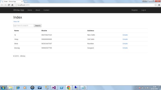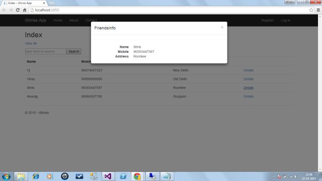 In this article we will implement modal pop up to display the detailed information of user after clicking on detail anchor. Here I am going to implement modal popup on list of my last article. So this is the view on which we are going to apply modal popup.