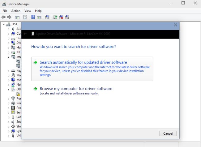 The Update Driver Software wizard opens with Search automatically for updates driver software that Windows will search the computer for and the internet for the latest driver software.