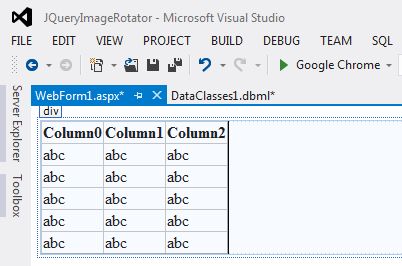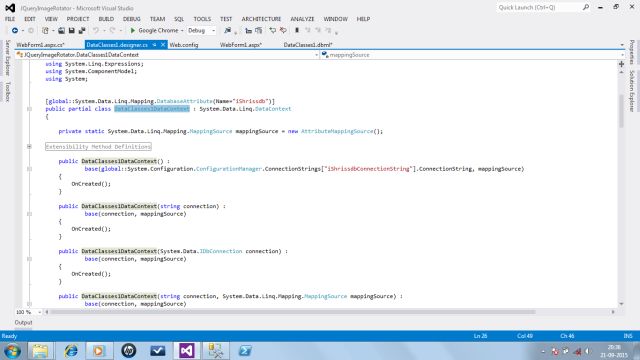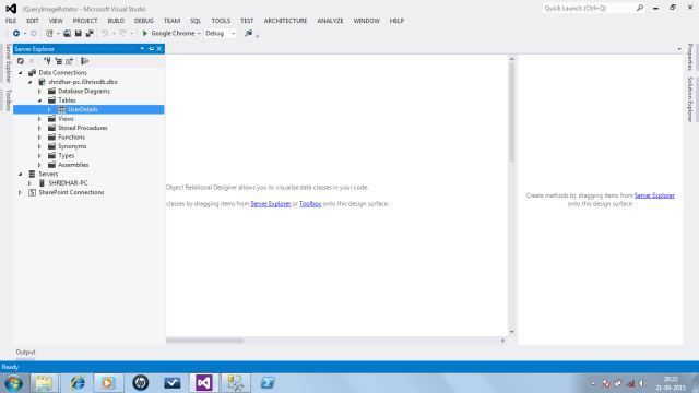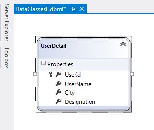 Step 9: Now drag and drop that table over DataClasses1.dbml. Here table name converted into a typical C# class and its attributes converted into properties.