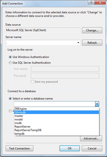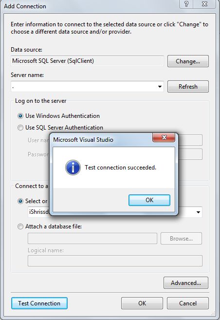 Step 5: Provide the Server name and Database name, here we are using local database (Windows Authentication).