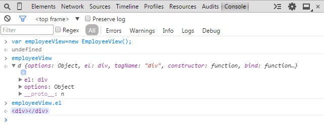 el defines the view for the object. By default it is an empty div. It refers to the HTML element, by which we can access the HTML element and its properties. All views have DOM elements. this.el can be created from an id, className, tagName and attributes properties. Let us use an example as in the following: