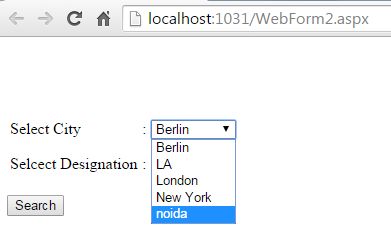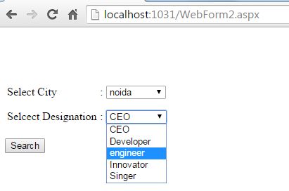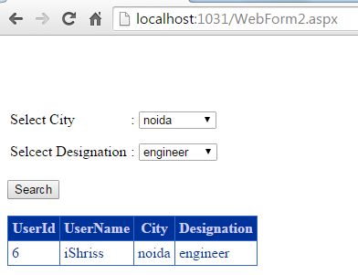 - SqlCommand cmd = new SqlCommand("select * from UserDetails where City = '" + DropDownList1.SelectedValue + "' and Designation='"+DropDownList2.SelectedValue+"'" , con);