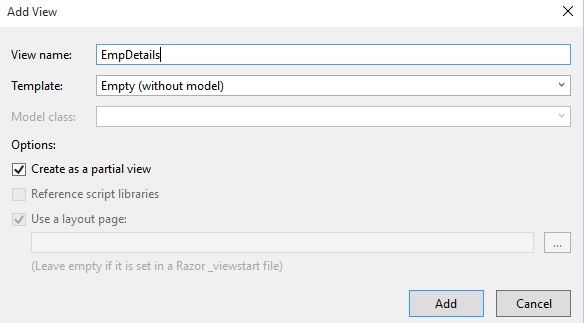 Right click on Model folder in the created MVC application, give the class name Employee or as you wish and click on OK.