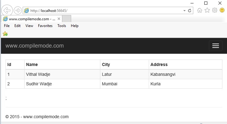 - Id = 1, Name = "Vithal Wadje", City = "Latur", Address = "Kabansangvi"