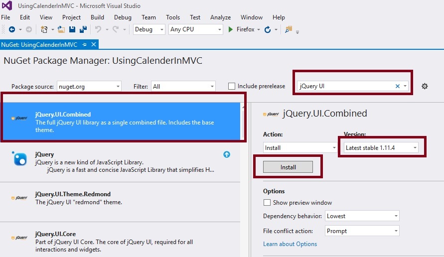 Choose appropriate version and click on Install button. It will install jQuery UI library to your project and library script file get added into the script folder of the created project which you can add reference into the project,