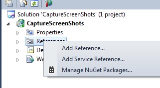 We are using the Screen class of Windows Forms to get our requirement that contains the many methods related to screen shots, so we need to add the reference for Windows Forms in our project. To add a reference, right-click on the project as in the following: