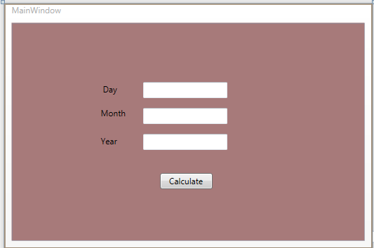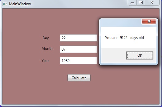 Now, run the WPF application and provide the input of day, month and year. I will enter my Date of Birth and then I will click on the "Calculate" button, it will show the output as in the following:
