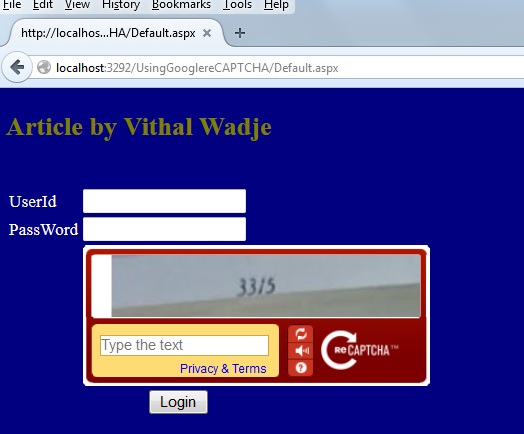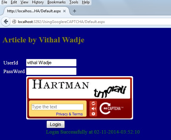 Now open the default.aspx.cs file and add the following code to the OnClick event of the btnLogin button to ensure that the CAPTCHA code is validated successfully: