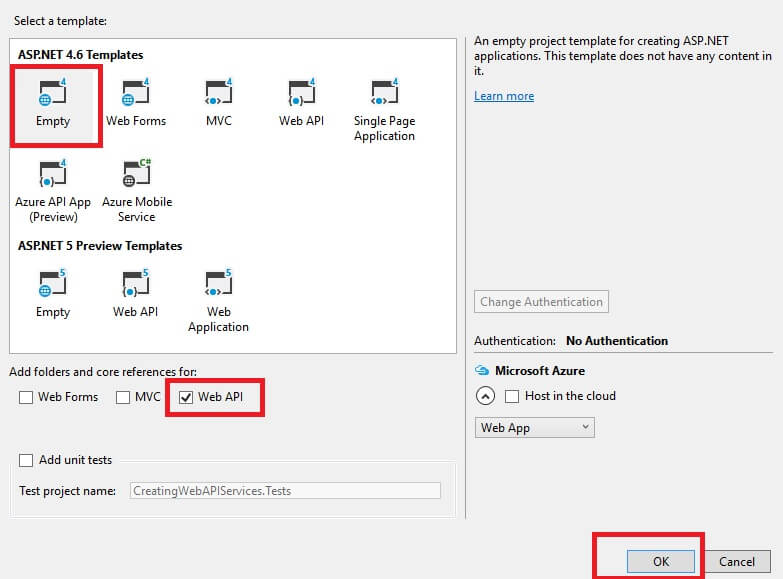 - "File", then "New" and click "Project", then select "ASP.NET Web Application Template" and provide the Project a name as you wish and click on OK, then the following windows will appear; select empty template and check on Web API as in the following image.