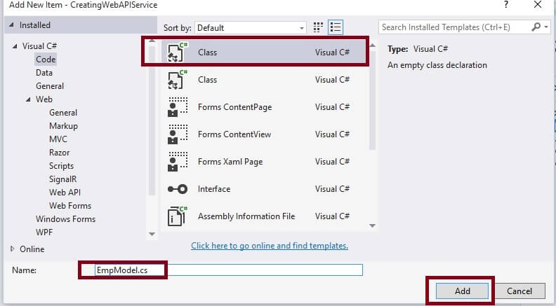 Right click on Model folder in the created Web API application, give the class name EmpModel or as you wish and click on OK.