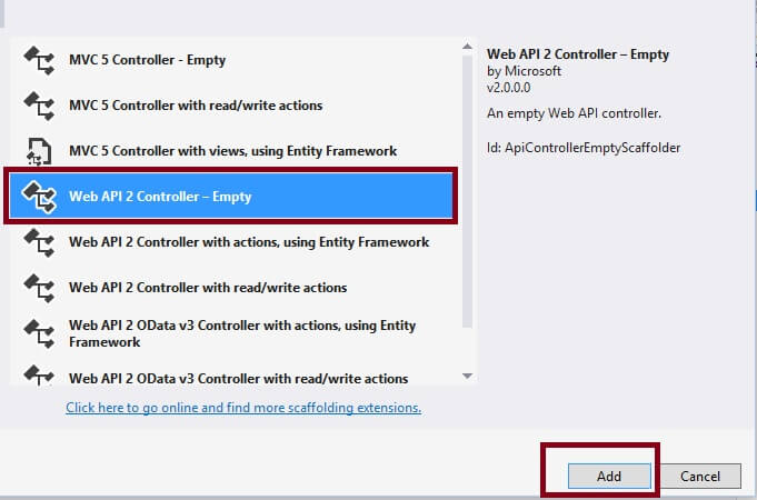 Right click on Controller folder in the created Web API application and Web API 2 Empty controller as in the following,