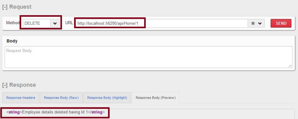 In the above image Web API REST Service, HTTP Delete method returns the 200 Status code means REST service is successfully executed and return the XML format output. I hope from the preceding examples we learned how to create Web API REST Service.