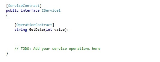 Now open the IServices1.cs file and declare the service contract (Interface) and Operation contract (method Name) as: