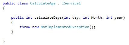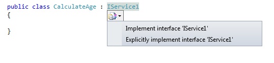 In the preceding example we have created the one class named calculateAge in the service.svc.cs file and implemented the IService1 interface in that. While implementing the interface after a mouse hover on the interface it shows two options of implementing the interface in a class that implements the interface that automatically Implements the method and the second one is implemented explicitly that is allowed to be implemented manually.