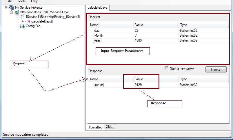 Now in the preceding test client window the Request section we see our method Input parameters that we created in the service1.svc.cs file, provide input values for the above three parameters as I have entered my date of birth.