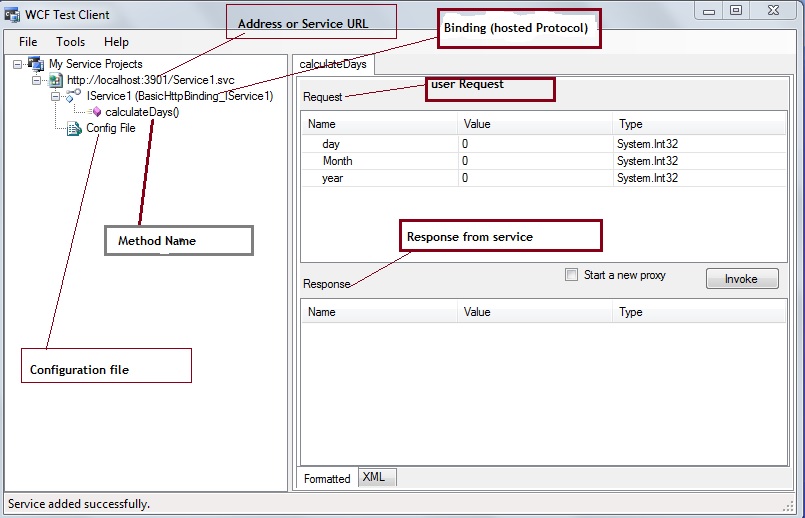 In the preceding test client window you have seen that it shows all the details of a Service including address, binding, Contracts and Method name with input parameters details and response details of input variable values that I highlighted in a box.