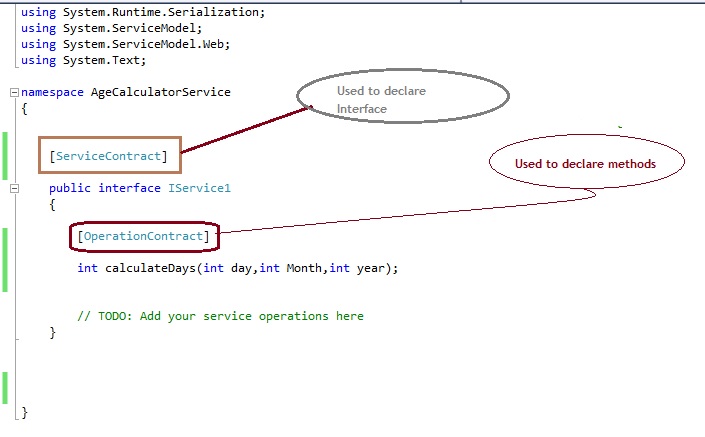 In the preceding example we declare the interface named IService1 under the ServiceContract and CalculateDays method with the three parameters under the operationContract.