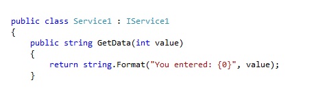 In the preceding example Service1 is the class name and IService1 is the interface name, and get data is the IService1 interface abstract method implemented in the svc.cs.