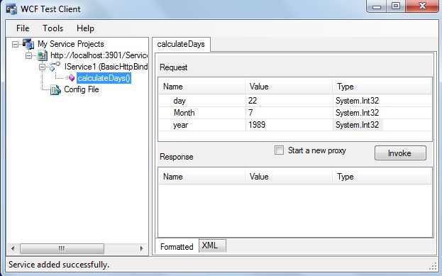 Now run the WCF application that shows the WCF Test client window to test the output of the application as: