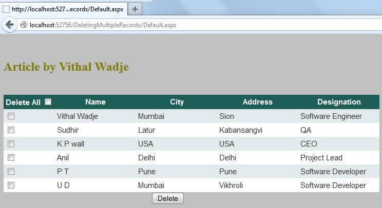 Now from all the preceding examples, we have learned how to delete one or more records from a GridView. I hope you have enjoyed this article while coding.