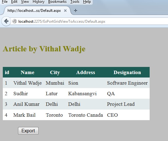 We now have records to export into Access. Let us start coding for our actual requirements. Add the VerifyRenderingInServerForm event after the page load that is required when exporting a Grid view to Excel, Word and PDF to avoid the run time error "GridView' must be placed inside a form tag with runat=server."