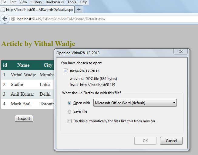 Now click on open with option ,then you can see that all grid view records will be exported into MS office word as