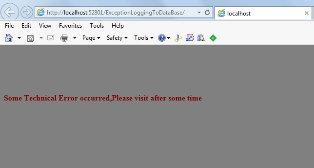 Now run the application The following dummy message we will be shown to the user and the actual error will be logged to the database table as: