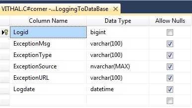 Now create the table and provide a name as Tbl_ExceptionLoggingToDataBase or as you wish to store the exception details as: