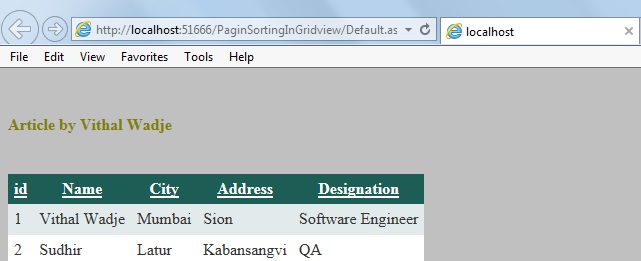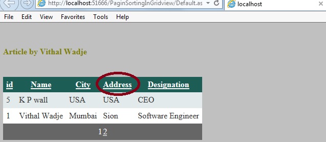 Now click on the address column of the GridView. The records will sort by Descending order as shown below because the current sorting is in ascending order.