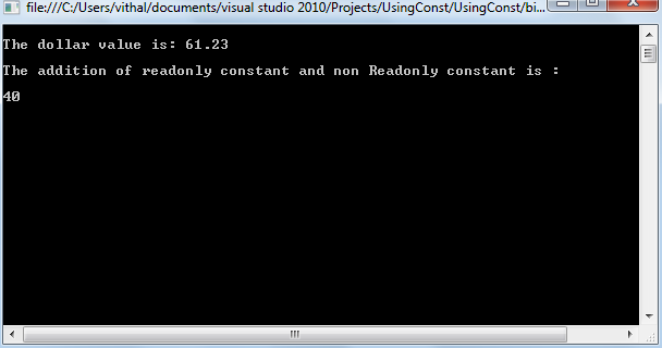 In the above program ,we have assigned the value for readonly constant through constructor which is defined in the config file,because readonly constant not must to assign the value at the time of declaration.