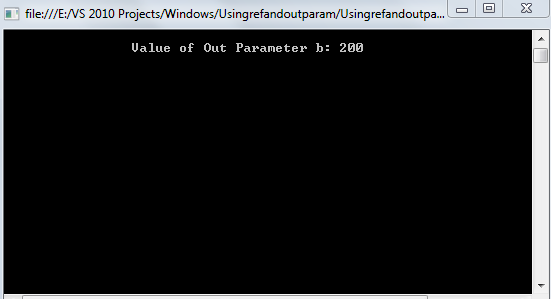 In the preceding program we declared one out parameter named b in the Getresult method that stores the result of the addition of two numbers and in the calling method we are ing the values and accessing the result in the
