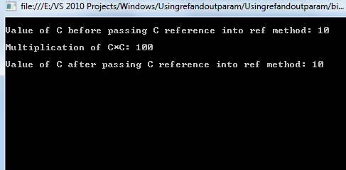 - Console.WriteLine("Value of C after ing C reference into ref method:" + " " + c);