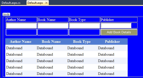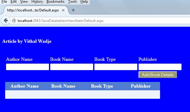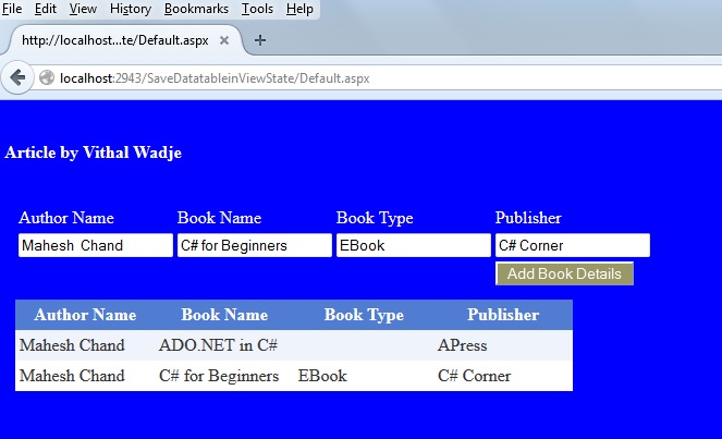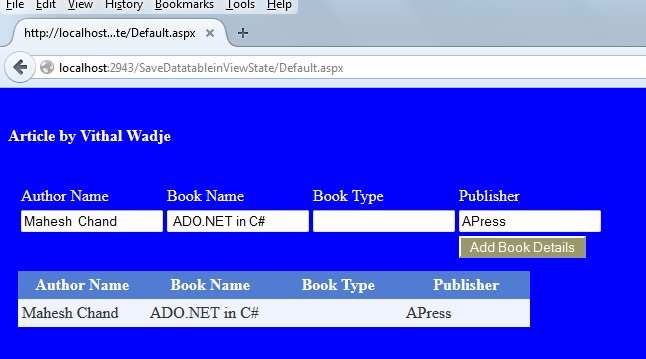 Now add some details into the textboxes above and click on the Add Book Details button. Then the records that were saved in the DataTable will displayed in the GridView as: