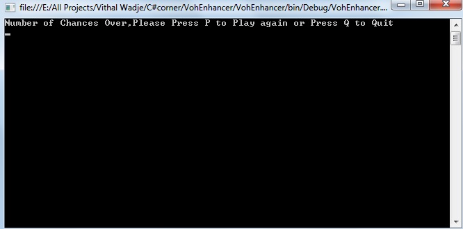 Now type "P" and press Enter because we want to play again. It will start again from the start of the application, now after guessing the correct option, it will show the following screen:
