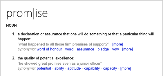 This is the meaning of promise that I found on Bing: "a particular thing that will happen." But then there is a problem, not all promises are fulfilled.