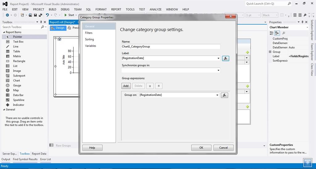 Here, in our database the RegistrationDate column format is "yyyy-MM-dd" and also it contains time. In our report we do not need to show this time part. To change the Registration Date format right-click on Registration Date in the Category Group and click on the Category Group Properties.