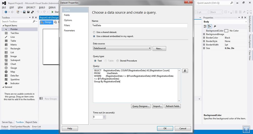 So here we are ready with our Report Design. Here for this report we are passing date parameters so we will set the data type Date/Time for both parameters, FromRegistrationDate and ToRegistratioinDate. To set the data type of the parameter, go to the View menu then select Report Data. In that in the Parameters section double-click on Parameter. You will see a Report Parameter Properties window. In that select the data type from the drop down list and click on OK. Here we are passing a date so I am selecting Date/Time.